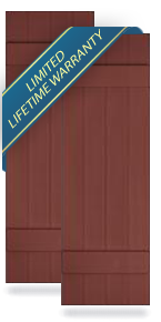 Exterior Board-n-Batten Vinyl Shutters have been the low cost shutter option for years. The rustic board-n-batten design fits well with most home styles. They come in variety of fade resistant colors, standard and custom sizes, and a limited lifetime warranty, making them a great choice for all.